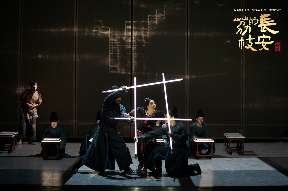 西安话剧院×事吾剧戏,大胆突破历史剧范式,以LED灯管矩阵构建现代性视觉语言。演员以高强度肢体模拟呈现千里奔袭,结合多媒体投影与各类音效,让“荔枝运输”化作一场跨越时空的赛博跑酷。舞台在唐风建筑剪影与科技光效间无缝切换,传统与现代碰撞出震撼的“赛博长安”效果。